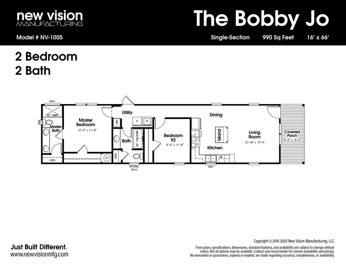 Special OrderThe Bobby Jo is a cozy and efficient 2-bedroom, 2-bath single-section home with about 990 square feet in a 16′ × 66′ footprint. It offers a welcoming covered porch entry that leads into a spacious living room flowing directly into a bright kitchen with an island — ideal for cooking, casual dining, or gathering with friends and family. The master bedroom is large enough for a king-sized bed and includes a well-designed private bathroom while the second bedroom and the second bath give flexibility for guests, family, or use as an office or hobby space. Thoughtfully crafted with smart layout and quality construction, the Bobby Jo delivers comfort in a compact package.