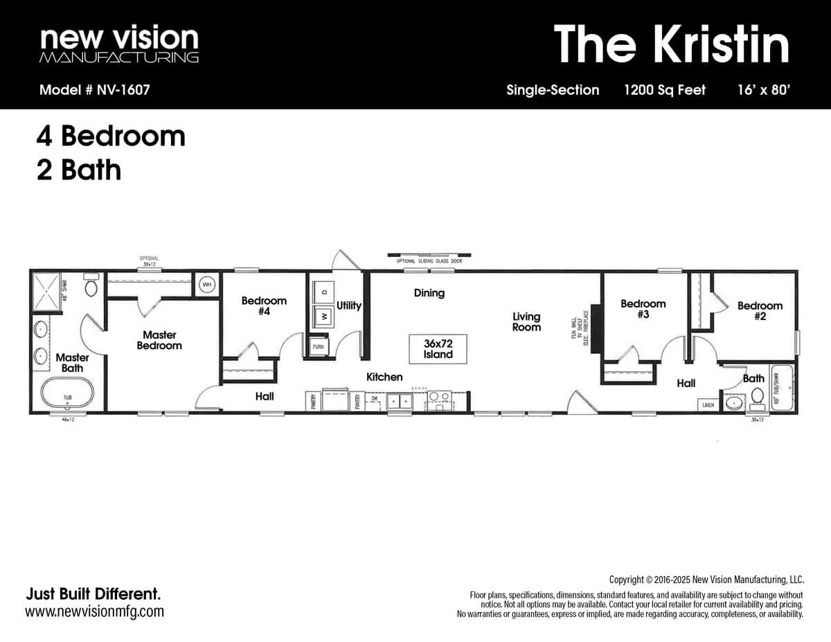 Special OrderThe Kristin is a 16 by 80 single section home with about 1200 square feet offering four bedrooms and two baths. It features an open living area and a kitchen with a large island pantry space and room for modern appliances. The master suite includes a soaking tub walk in shower and dual sinks while the secondary bedrooms are well sized with convenient access to the hall bath. A utility room adds extra storage and laundry space. The Kristin provides a practical comfortable layout with modern touches throughout.