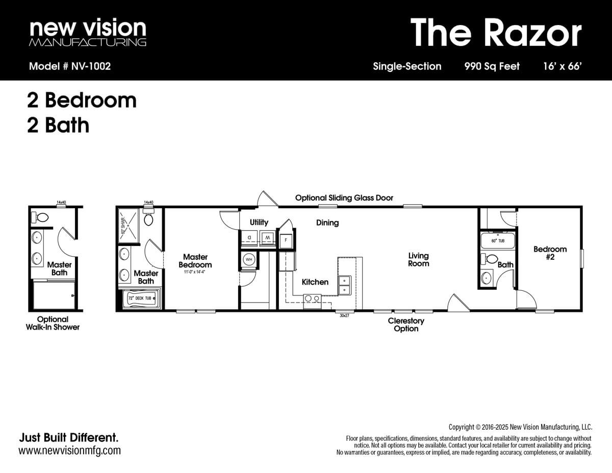 Special OrderThe Razor is a comfortable and efficiently designed 2 bedroom 2 bath single section home offering about 990 square feet in a 16 by 66 layout. Its extended length creates a spacious feel throughout the open living and kitchen area where a pantry and eat bar add convenience for everyday use. The master suite provides a relaxing retreat with a large soaking tub and walk in shower, while the second bedroom and full guest bath offer flexibility for family, guests, or a home office. A dedicated utility room with washer and dryer hookups adds practical functionality, making the Razor a smart choice for those seeking a manageable home with a surprisingly roomy interior.