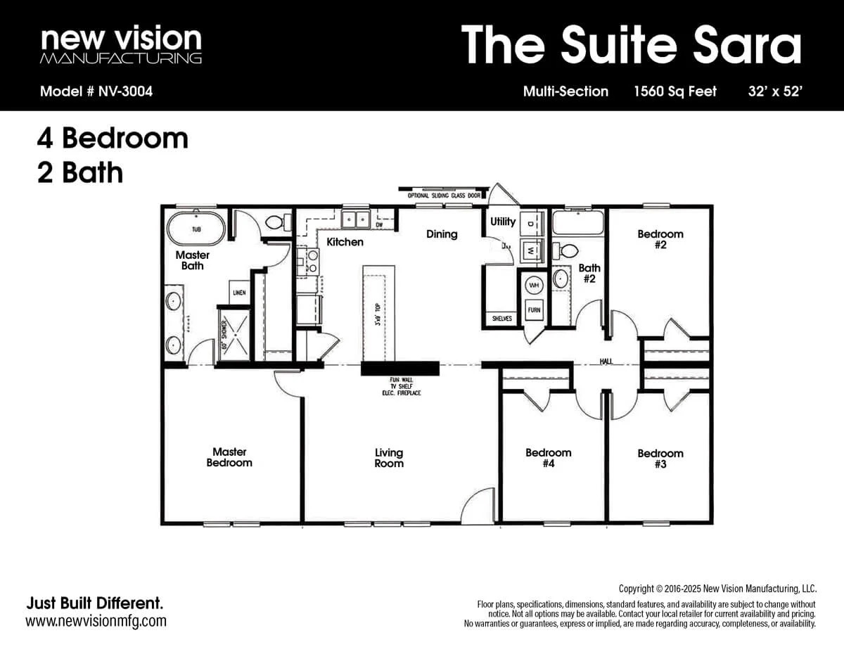 Special OrderThe Suite Sara is a modern four bedroom two bath home with 1560 square feet of living space and an open layout that connects the living room dining area and kitchen. The kitchen includes a center island ample cabinets a pantry and full appliances. The master suite offers a relaxing bath with a soaking tub walk in shower and dual sinks while the secondary bedrooms are well sized for family or guests. A utility room provides extra storage and convenience and the built in electric fireplace and entertainment wall add a warm stylish touch.