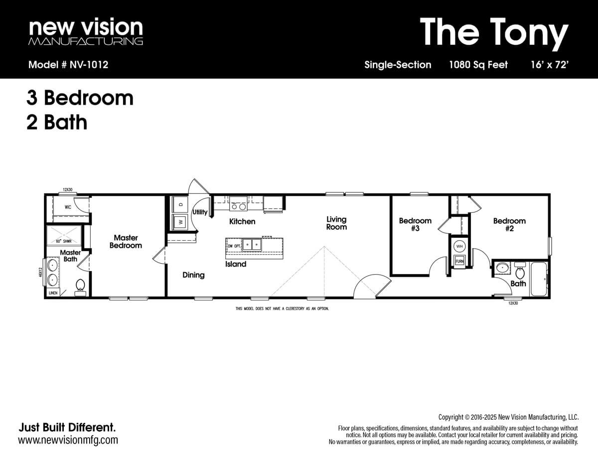 Special OrderThe Tony is a single section home sized 16 by 72 offering three bedrooms and two bathrooms within about 1080 square feet of well organized living space. It features an open layout with a kitchen that flows into the living and dining areas and includes a kitchen island an eat bar a pantry and full appliances for easy everyday living and entertaining. The master suite has a walk in closet and an ensuite bath with dual sinks and a tub and shower combo while the two guest bedrooms share a second full bath. The Tony offers a compact comfortable and practical layout suited for families first time homebuyers or anyone wanting an efficient modern home.